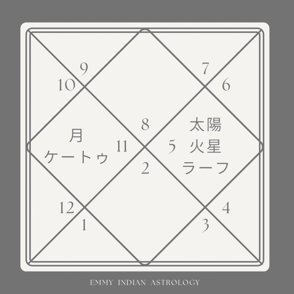 こちらのクンダリ―では、お父様を表す10室に「獅子座 太陽 火星 ラーフ」が位置しており、お母様を表す4室には「水瓶座 月 ケートゥ」が配置されています。